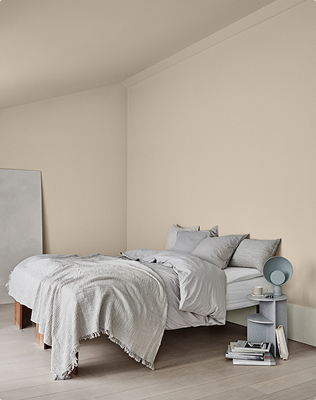 Grain är en solig, varm beige kulör med tydlig gul underton. I ljusa rum i söderläge kan Grain upplevas som gulbeige, medan den i mörkare rum i norrläge drar mot en gyllene beige. Vacker mot naturmaterial och i möte med varma gula kulörer som vår ljusgula Miso.