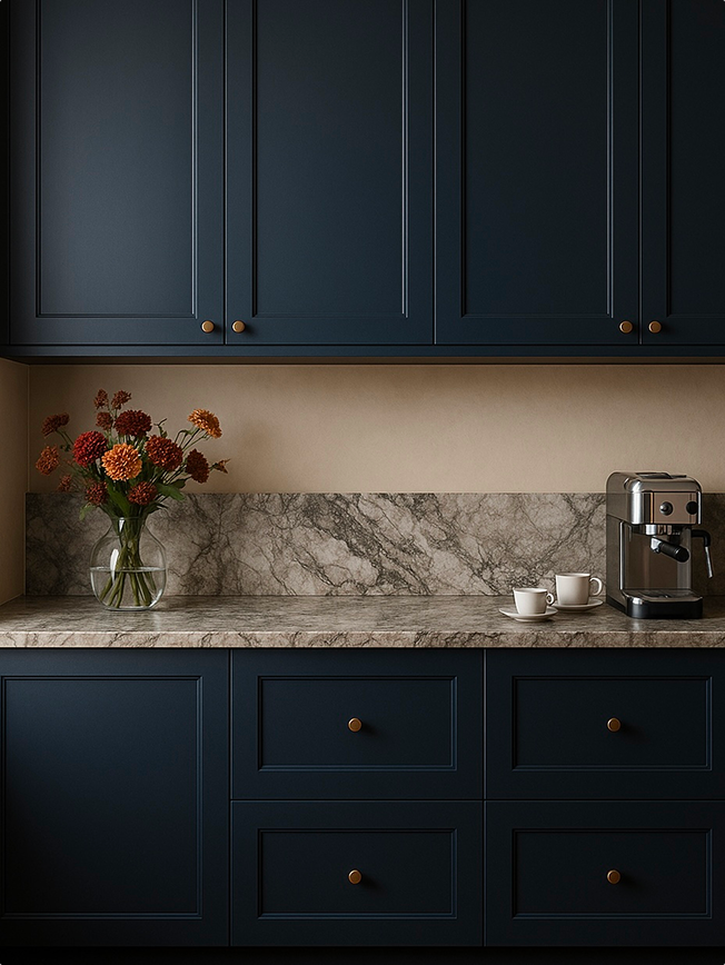 Är en djup och rik blå kulör som utstrålar karaktär och elegans. En färg som skapar tyngd och harmoni – lika vacker ensam som i kombination med ljusare toner.